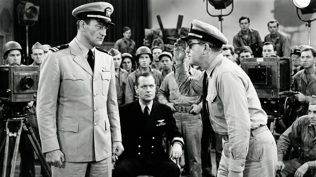 Came home with the Purple Heart. The credits will say directed by John Ford, Captain USNR. [music] Wayne’s credit will just say his name. No rank, no service. Everyone on set knows it. Assistant director calls out, “Quiet on set, rehearsing the departure scene.” This is a simple shot. An admiral is leaving. Wayne’s character salutes him.