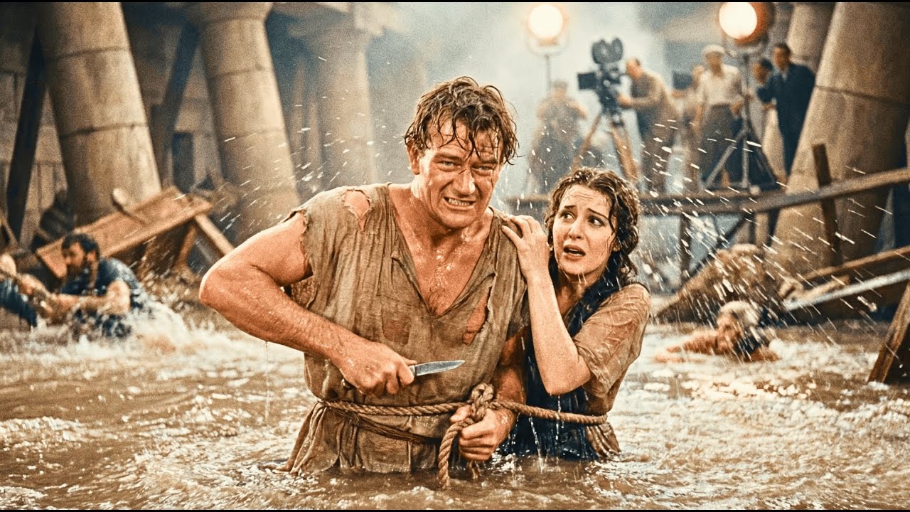 could hold enough water to drown a small town. Duke Morrison arrived on set at 6:00 in the morning, [music] wearing the same threadbear costume he’d worn for 3 weeks straight. A rough linen tunic that barely reached his knees, [music] a rope belt, sandals that didn’t fit right. They’d hired 3,500 extras for the flood sequence, maybe more depending on who you asked, and every single one of them was crammed onto platforms and steps [music] and balconies, waiting for the cameras to roll.