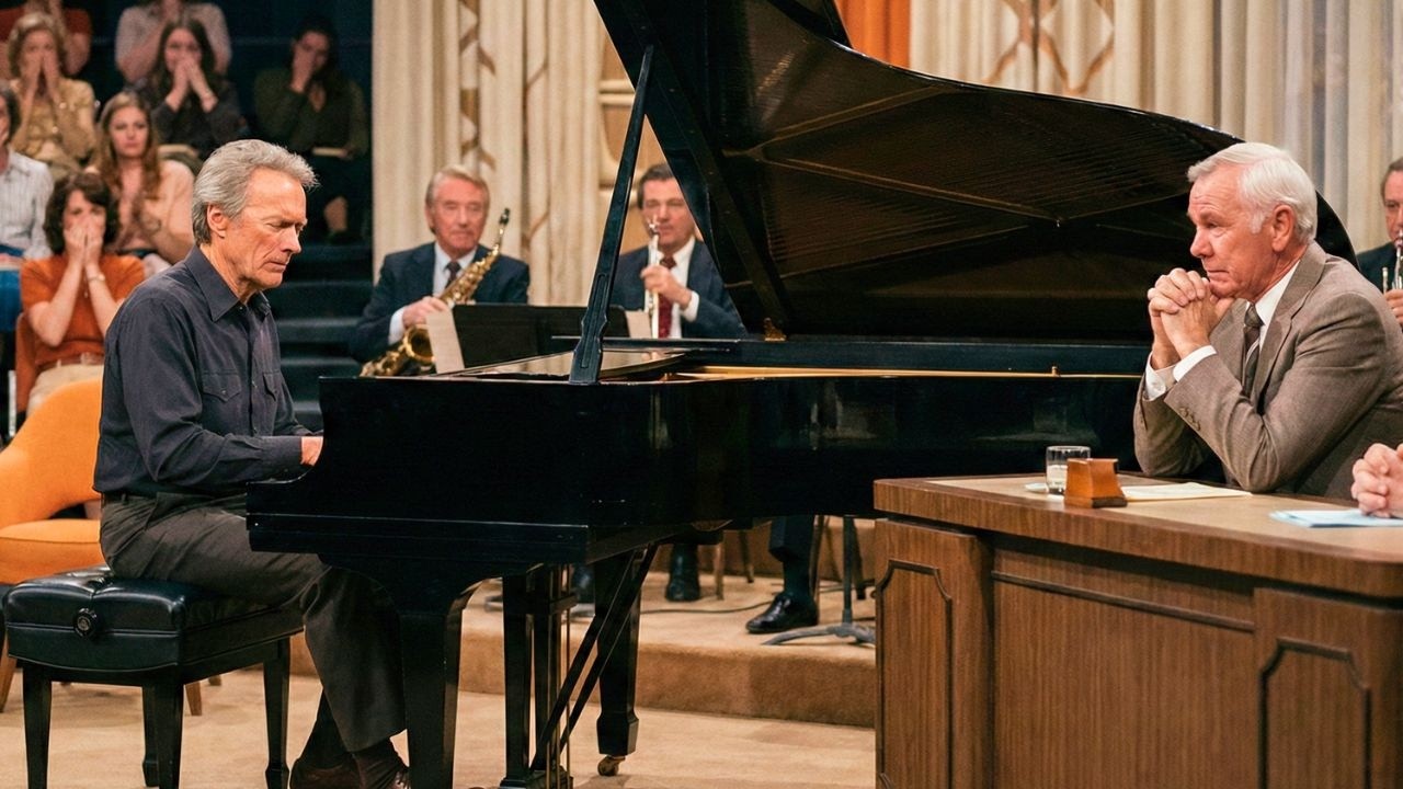 Clint played with genuine skill, his fingers moving across the keys with practice precision, his eyes closed, his entire body relaxed into the music. This wasn’t a movie star doing a party trick. This was a real musician playing something that clearly meant something to him. Johnny’s smile faded. His hands, which had been holding his Q cards, slowly lowered to the desk.