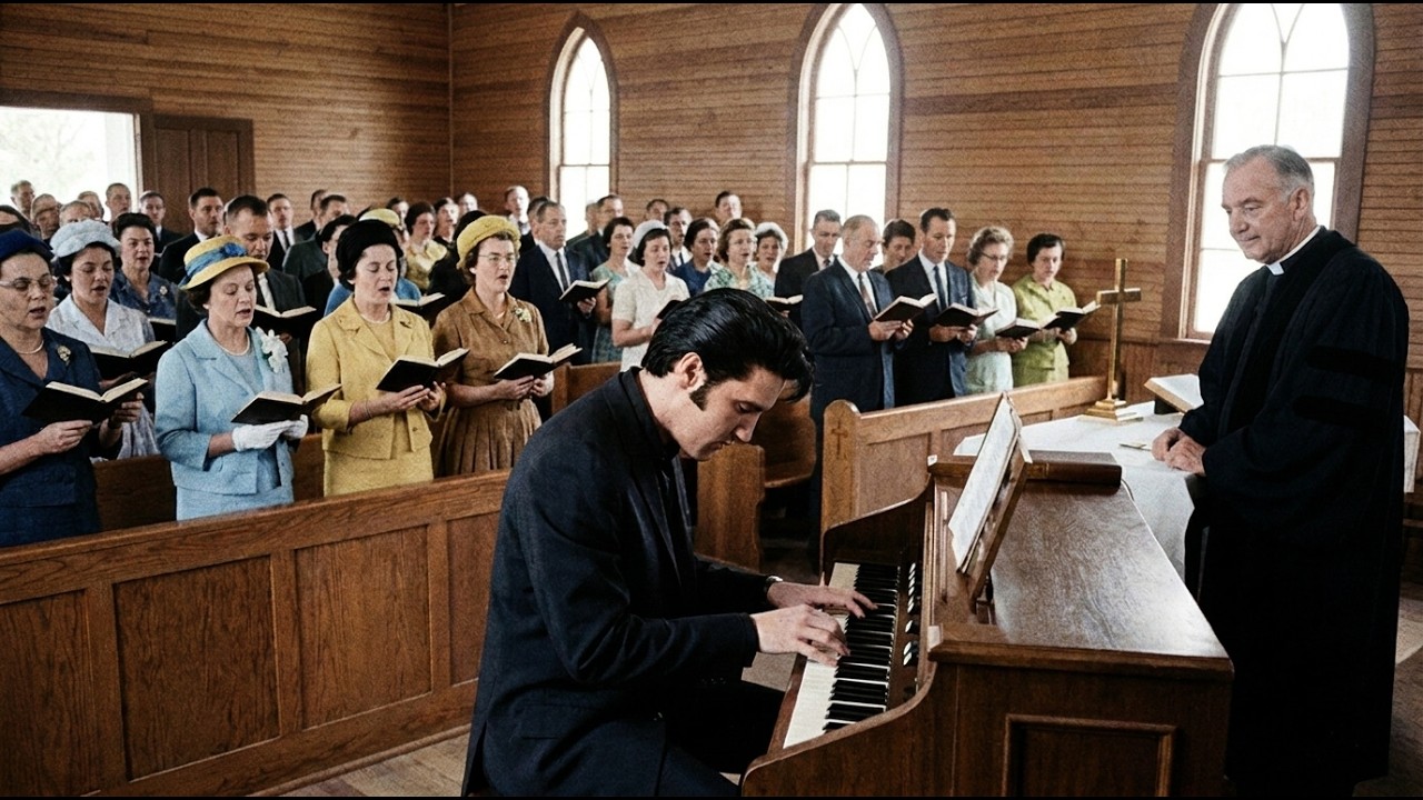 A visitor near the back said something quietly to the person beside her. The doctor in the fourth row, who was kneeling beside Ruth, raised a hand briefly to indicate that the patient was stable. The man in the third row stood up. He had been sitting slightly apart from the other Sunday morning arrivals, not at the end of the pew where people sat when they wanted to leave easily, but in the middle, which was where people sat when they had come to be in the service rather than to observe it from a comfortable distance. He was in his late 20s, dark-haired, dressed simply in a dark suit that was neat without being elaborate. He had the kind of face that was recognizable in a different context, in a photograph, on a screen, on the cover of a record, but that in a church pew on a Sunday morning in a small Tennessee city was simply the face of a young man attending a service, which was the only context anyone in the room was operating in. He had come in just before the service began and had found his seat without drawing attention to himself, which was something he was practiced at.