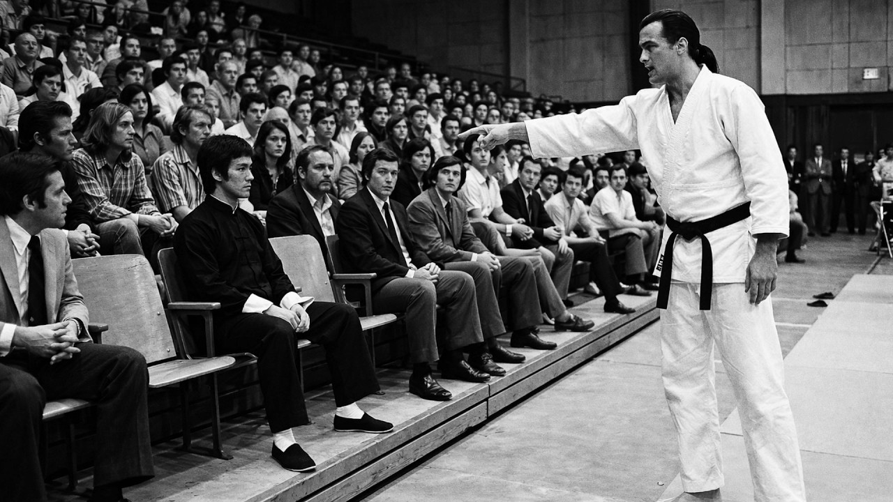 Bruce just provided the classroom. He pushes through the doors. Gone. Inside 500 people find their voices. Conversations exploding. What was that? Did you see? His arms just stopped working. Someone knows. Bruce Lee, martial arts instructor. Some television work. The name passes through the crowd. Bruce Lee, the small man in the suit who shut down Steven Seagal’s nervous system in 9 seconds.