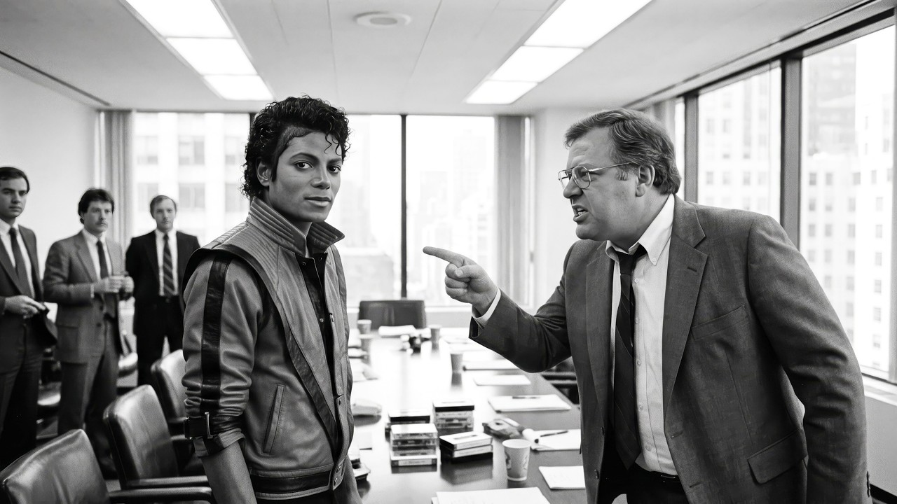 The head of artist relations is staring at the ceiling. And at the far end of the table in a chair that seems slightly too still compared to everyone else’s restless energy. Michael Jackson is listening. He is 24 years old. He is wearing a red jacket with black panels and his hair is perfect and his hands are flat on the table in front of him, completely relaxed.