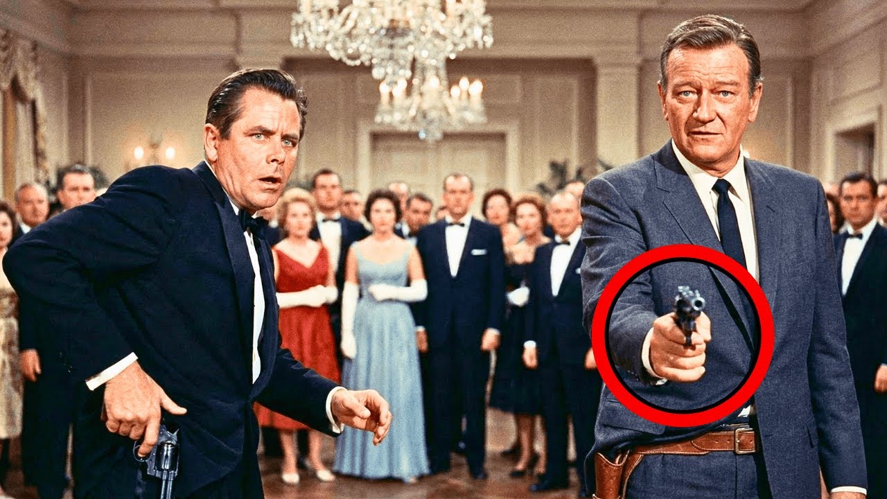 Glenn Ford’s hand hit the grip, cleared leather, and clicked the hammer in 4 seconds flat, and the whole Western Heritage Awards crowd erupted while John Wayne sat at the bar and didn’t even move his glass. Wait, because what the Duke said in the next 3 minutes turned Ford’s fastest draw in Hollywood into a philosophy lesson, and half that room still talks about the silence that followed.