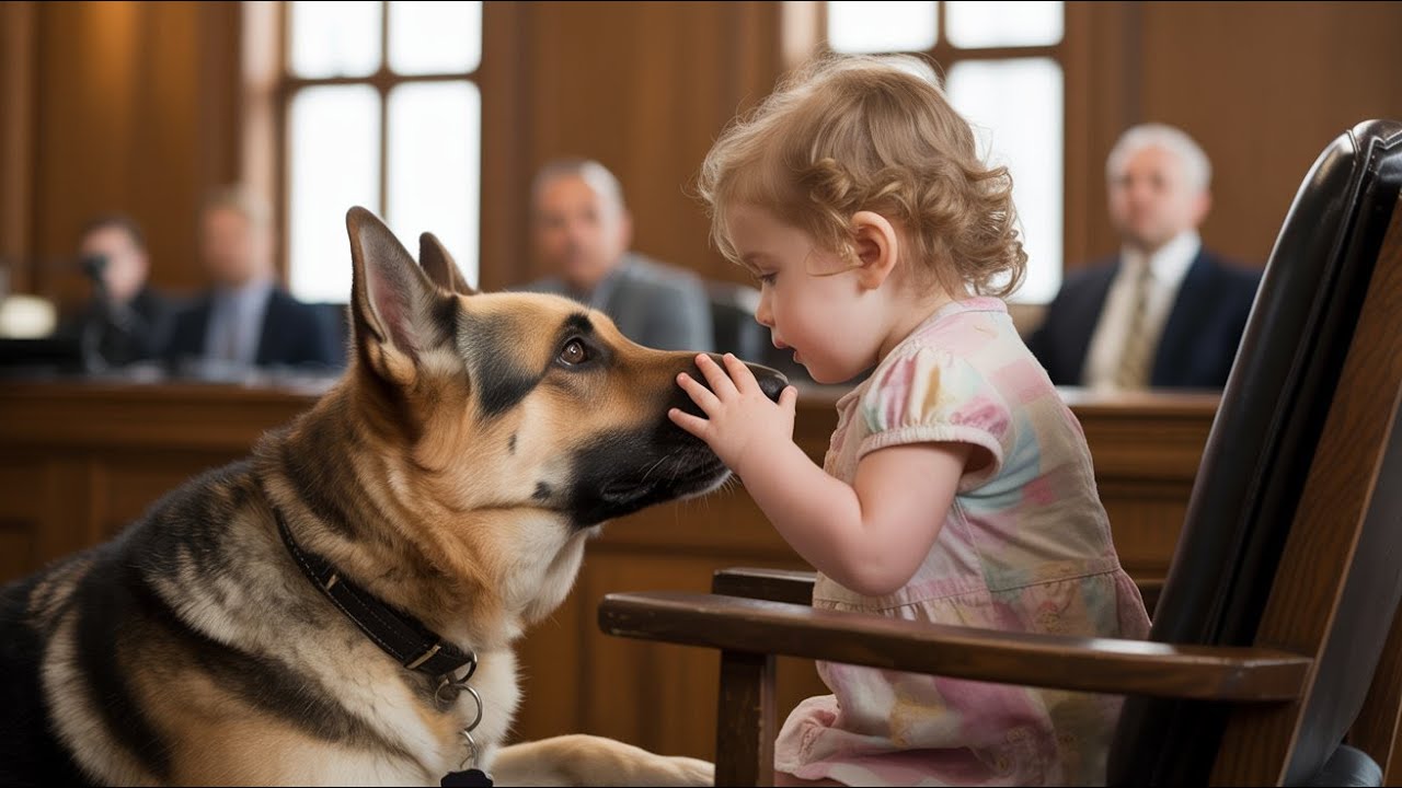 The shepherd lowered his head slightly in response, his eyes soft, his chest rising and falling in steady rhythm. The little girl took a deep breath and the courtroom, every attorney, every juror, every spectator, even the judge himself held theirs. What would she say? Would she giggle? Would she call out to him? Would she touch him? The moment hung suspended, stretched thin as glass.