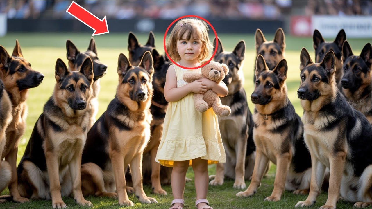Ellie’s small feet carried her steadily across the grassy arena, every step measured and sure. The crowd’s chatter faded into a tense silence as the little girl walked toward the center, surrounded by 14 alert German shepherds standing like statues around her. The dog’s powerful bodies towered over her tiny frame, but Ellie moved without hesitation or fear.