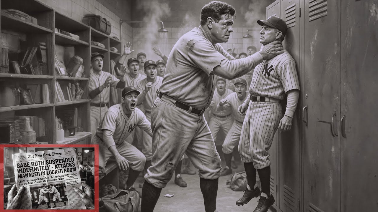 Ruth gets angry, grabs Huggin, lifts him, slams him against the wall, hand around his throat. Physical threat. Huggin doesn’t shake. “Let me go,” he says. “Now.” Ruth’s face is red, his hand on Huggin’s throat. 220 lbs of rage. And in that moment, in that room, the most dangerous 30 seconds in baseball history begins. The locker room is silent. Dead silent.