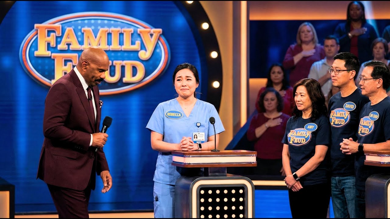 Sometimes  angels don’t have wings. Sometimes they have stethoscopes, gentle hands, and hearts big enough to hold the fears  of children who shouldn’t have to be brave. That’s what 28-year-old Rebecca Chen proved  when she stood at the Family Feud podium in her crisp blue scrubs, fresh from a 12-hour night shift at Children’s  Hospital of Philadelphia, and gave an answer that stopped Steve Harvey’s heart and reminded an entire television  studio that some people choose to spend their lives being