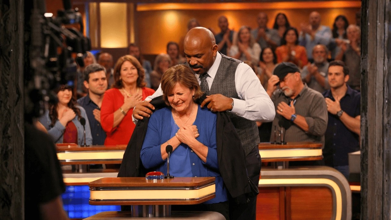 It smelled like cologne and comfort. The weight of it on her shoulders felt like an embrace. The opposing family started clapping. Then the audience joined in slowly at first, then louder until the entire studio was on its feet. Steve turned to the cameras, which were rolling again. You know what? Family feud can wait. This moment right here.
