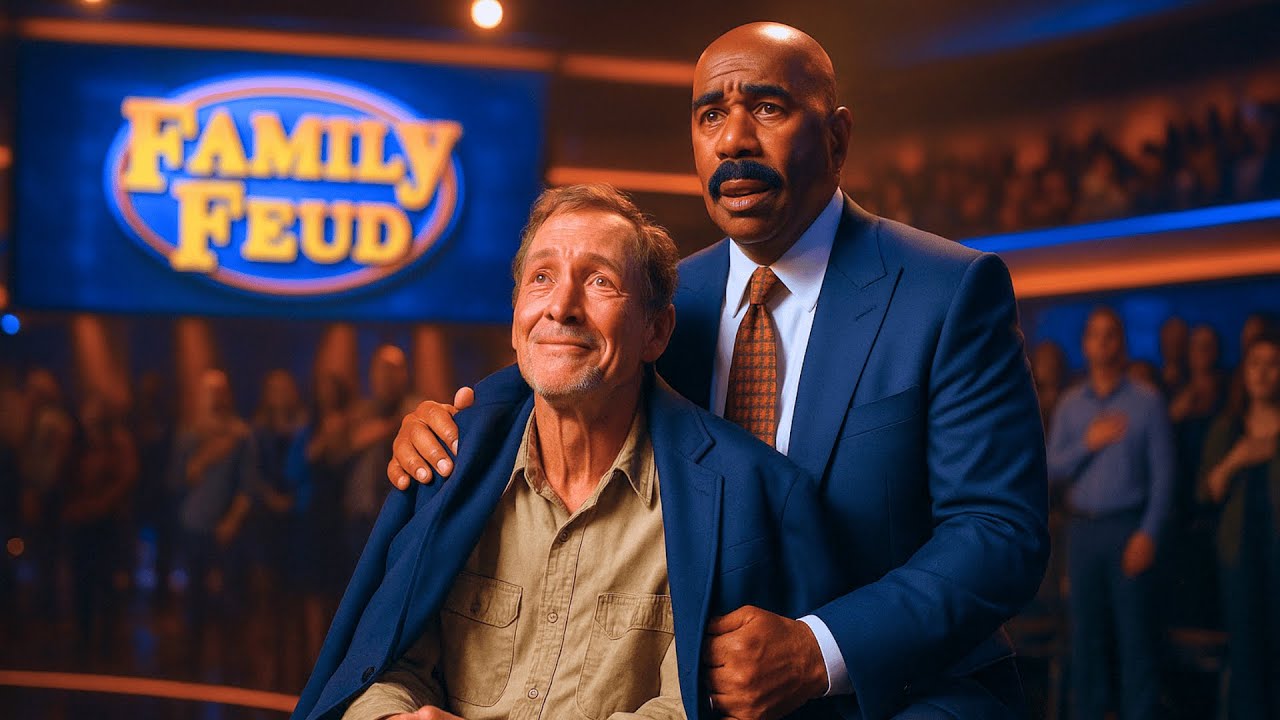 The clipboard fell from the producers’s hands with a sharp clatter that echoed through the Family Feud studio like a gunshot. Steve Harvey had just done something unprecedented in 40 years of television. Something no producer, no executive, no veteran crew member had ever witnessed. He walked away from his podium midame, abandoned the carefully scripted rhythm of America’s favorite game show, stepped into the audience, and knelt down beside a man whose story was about to change everything.