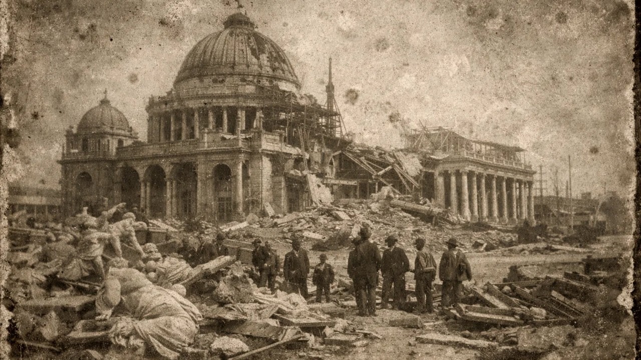 That land did not exist before the fair. It was created by dumping rubble and debris from the 1906 earthquake into the bay, converting the physical remnant of disaster into developable real estate. Every building constructed on that site was designed and contracted as temporary. Every building was demolished after the fair closed with one exception.