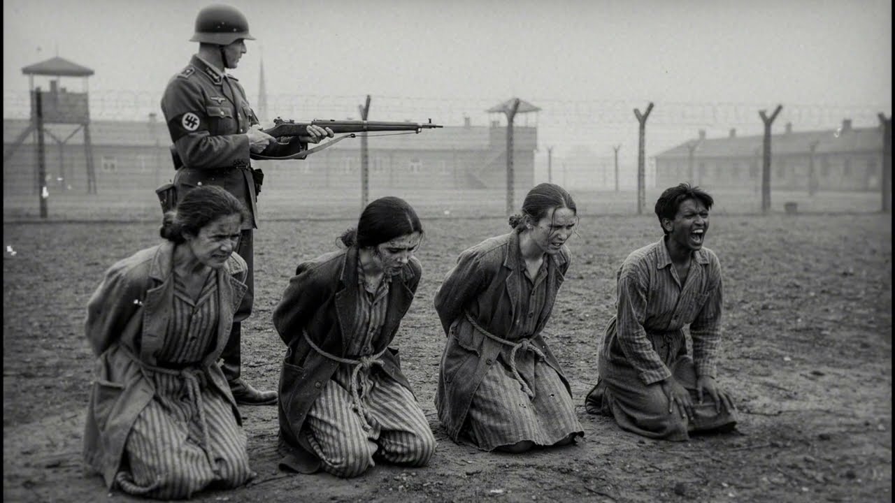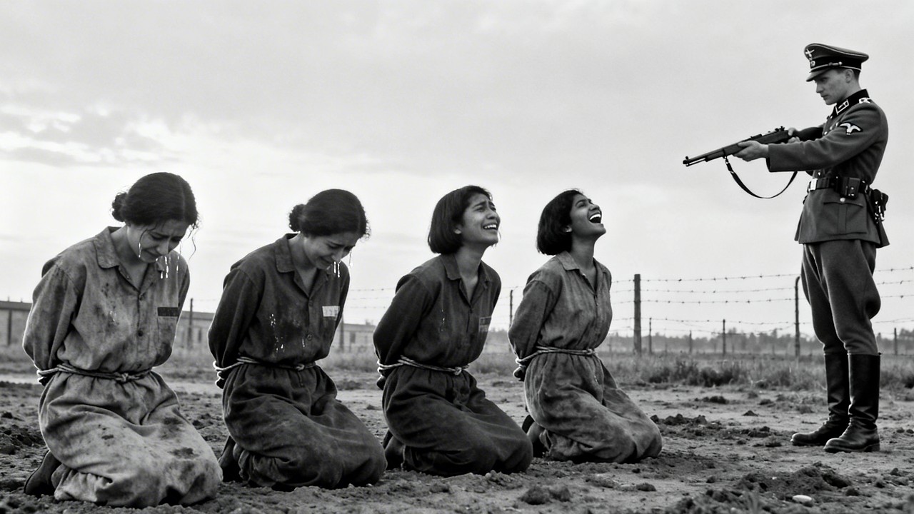 She’s told them nothing. Not one name, not one address, not one code, nothing. The SS officer walks behind the kneeling women, checks his pistol. Walter P38. Eight rounds. He only needs four, one for each prisoner. This is the last thing Norin at Khan will ever see. She turns her head, looks at him, and smiles.
