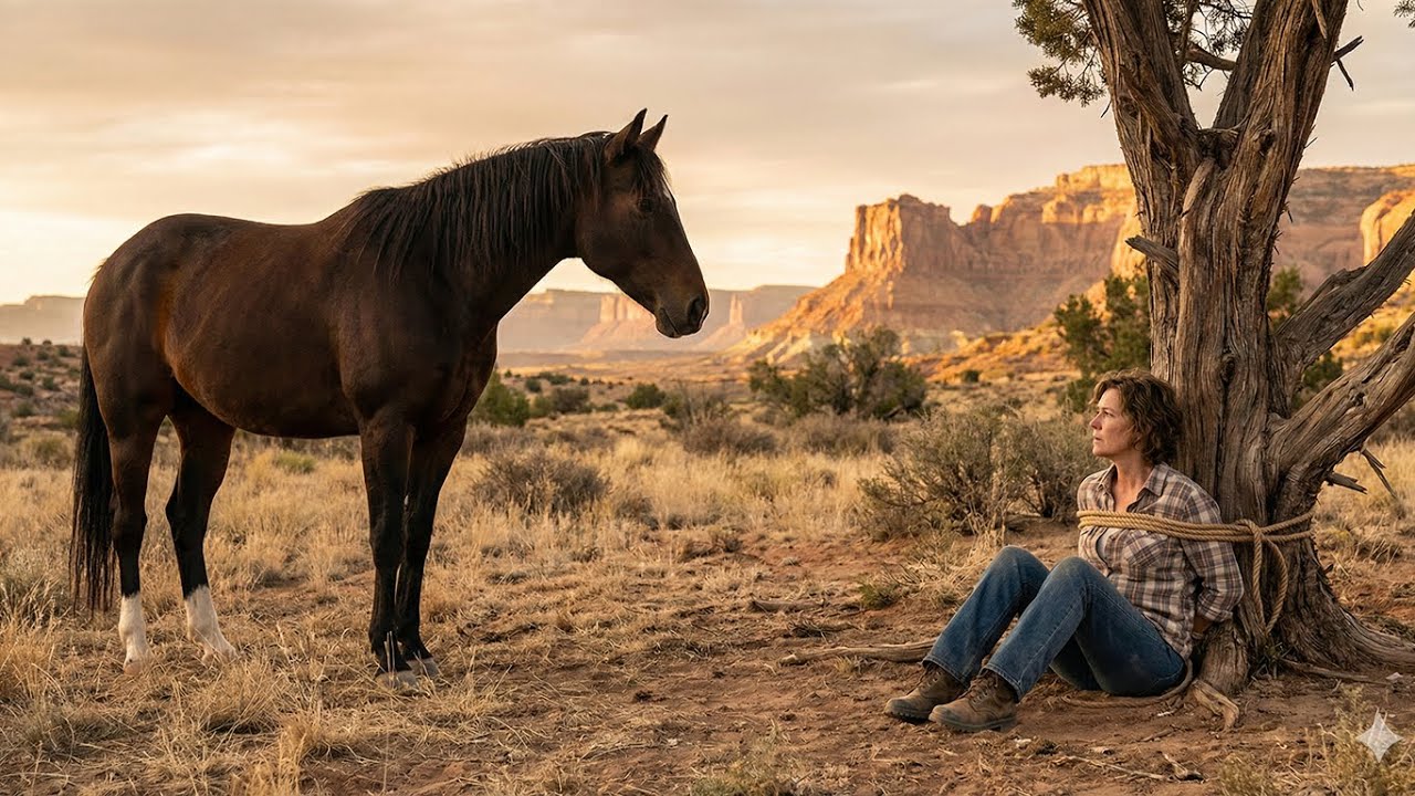 The wind fell silent, and Susan was alone in the growing darkness, tied to a tree in the bad lands, freezing, bleeding, and terrified. Hours passed. Her screams faded into the night. Coyotes circled. Her strength slipped away, and when she finally lost all hope, when her mind began to drift into darkness, a shape appeared on the ridge, massive, black, silent, the wild stallion, Cipher, and he was walking straight toward her.