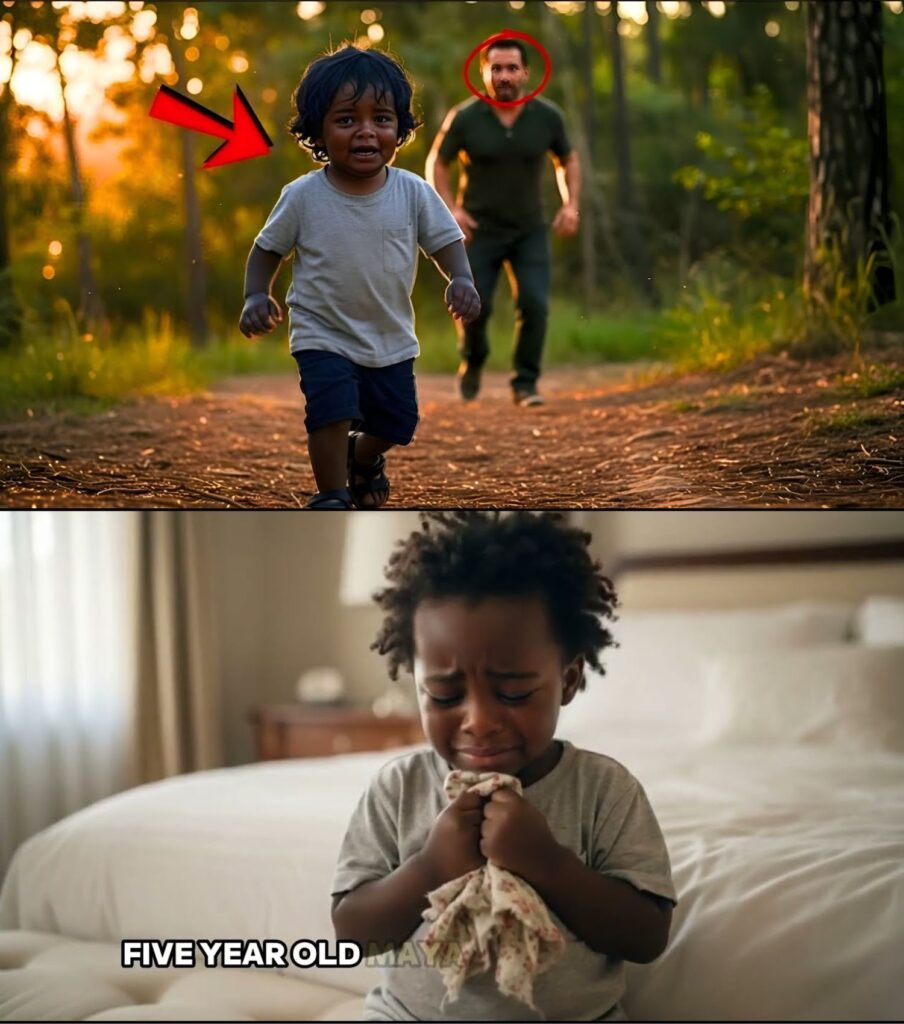 “Maya!” Evan called, his voice sharp with panic. “Wait!” But she didn’t. She bolted toward the trail, slipping in the grass but pushing herself faster, one hand clamped around the scrap of cloth like a lifeline. Her sobs echoed through the trees, tangled with the rustle of leaves. He stumbled after her, his polished shoes sliding awkwardly on roots and loose soil. The sun was sinking, shadows stretching long and thin across the ground, turning the woods into a maze of dark and light.