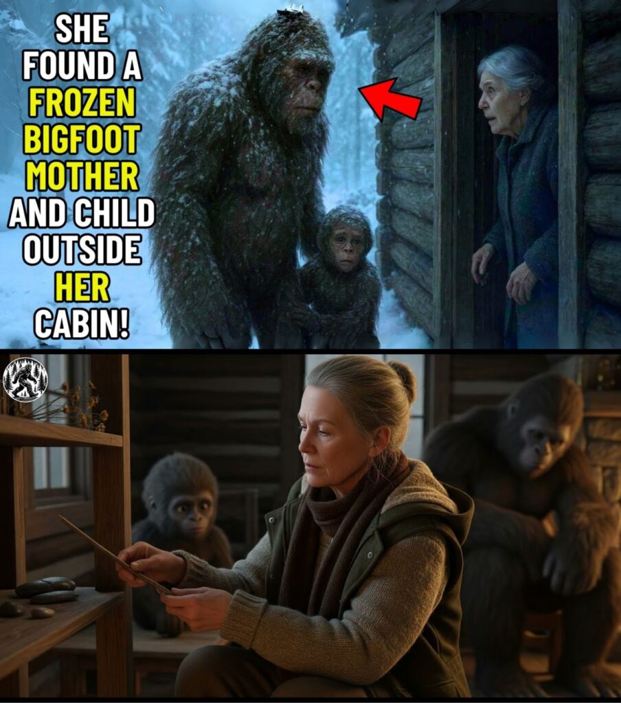 For three hours, Elias and the Mother Bigfoot sat in a silence so heavy it felt sacred. Elias fed the fire until the cabin glowed orange. He offered the mother a bowl of warm broth. She sniffed it, her nostrils flaring, and then drank it in a single, desperate gulp.