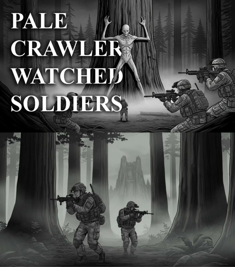 There is a way humans climb: we reach, pull, brace, shift. There is a way animals climb: claws dig, muscles coil, momentum bursts. This wasn’t either. This thing’s ascent was continuous, fluid, eerie in its lack of effort. Its limbs extended at angles that seemed anatomically wrong, like a sketch drawn by someone who had seen a person once and remembered only the rough idea. Thermal optics should have lit a living creature bright against the wood, but this thing was just barely warmer than the bark, a faint ghostly outline instead of a body. That alone made no sense. No mammal has a thermal signature that faint. No reptile should be climbing a vertical sequoia at night in forty-degree fog. The fog thinned just enough for me to see its form—elongated limbs, narrow torso, a bulbous head pressed disturbingly flat against the bark—and for a moment I thought it was hugging the trunk like a child clinging to a parent. Then it turned its head downward, and even eighty feet above us, even through night vision distortions and fog, I felt the unmistakable electric snap of being seen. Not noticed. Seen.