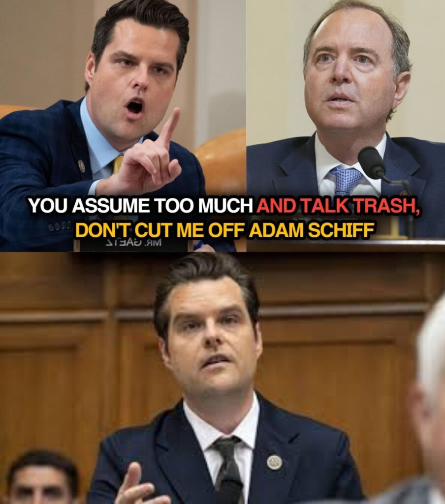 From the instant Matt Gaetz walked into the Oversight Committee room, the atmosphere changed. The usual murmurs quieted. Staffers stiffened. Photographers repositioned themselves. Schiff had already settled in his chair, flipping through his talking points with the smug confidence of a man fully convinced of the invincibility of his own narrative. But Gaetz walked in differently — not smiling, not grandstanding, not rehearsing a monologue. He walked in like a man who had come loaded for war, and the second their eyes locked across the table, everyone in the building knew they were seconds away from witnessing one of the most explosive congressional confrontations in years. Schiff thought he was ready, but Gaetz wasn’t just prepared — he was primed, focused, and holding an arsenal of facts sharp enough to cut through Schiff’s theatrics like steel through paper.