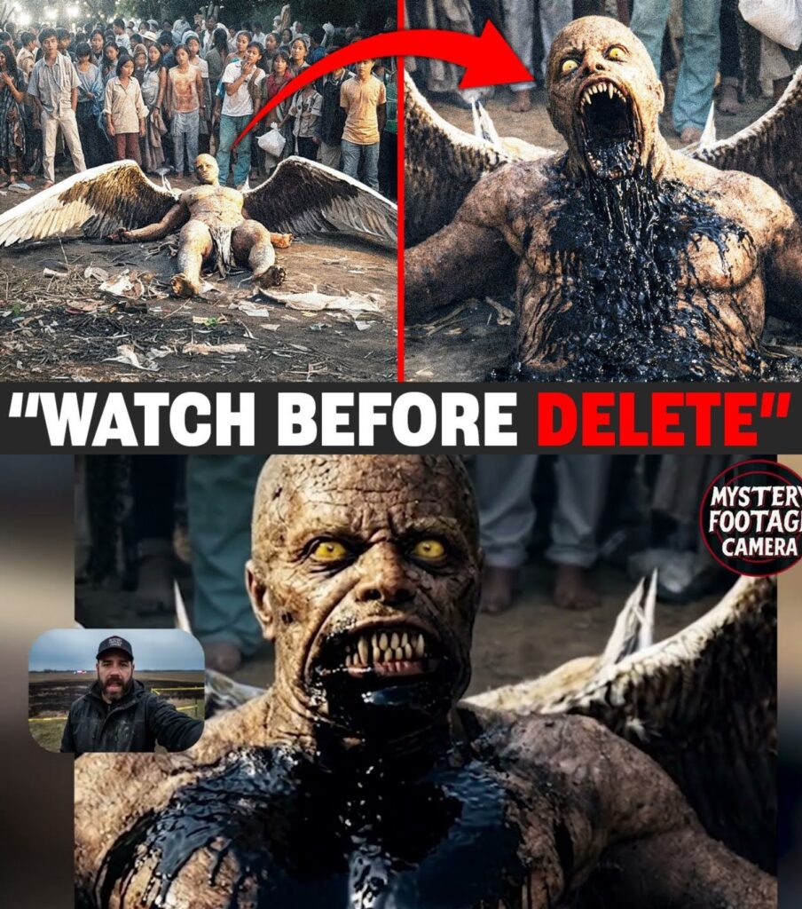 It hit the ground like something torn straight out of humanity’s forgotten nightmares. A broken husk still burning with a rage that didn’t belong to Earth. Witnesses said the creature’s first scream sounded like metal being ripped apart underwater—a sound so violent it made their ribs vibrate. Its wings, tattered and bone-framed, dripped with a tar-like black liquid, twitching as if remembering how to fly before collapsing under their own weight.