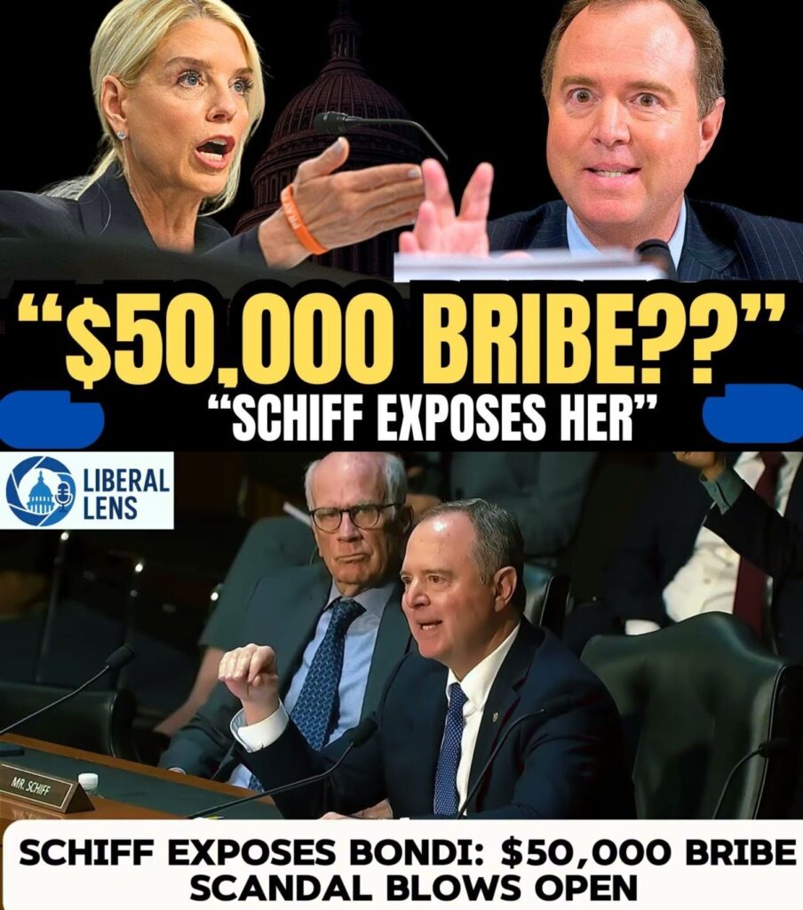 Schiff allowed Bondi to get through her opening statement, though his expression made it clear that every minute felt like an irritation he intended to repay later. Bondi spoke in her usual careful cadence, emphasizing integrity, responsibility, public service, and—ironically—ethics. But everyone in the room understood why they were gathered: allegations that Bondi had accepted a $50,000 bribe connected to political influence and special access. She had dismissed the accusations as smears. Schiff had come prepared to prove otherwise. As soon as Bondi finished speaking, Schiff leaned into his microphone, and the air tightened like a wire pulled to its breaking point.