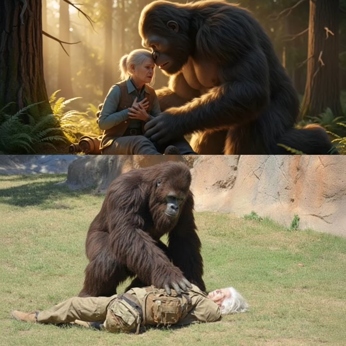 When the first rescue team arrived, they froze. Guns were drawn, tranquilizer darts were loaded, but no one dared fire. They saw a seven-foot beast hunched over a frail woman, his body quaking with grief and protective fury.