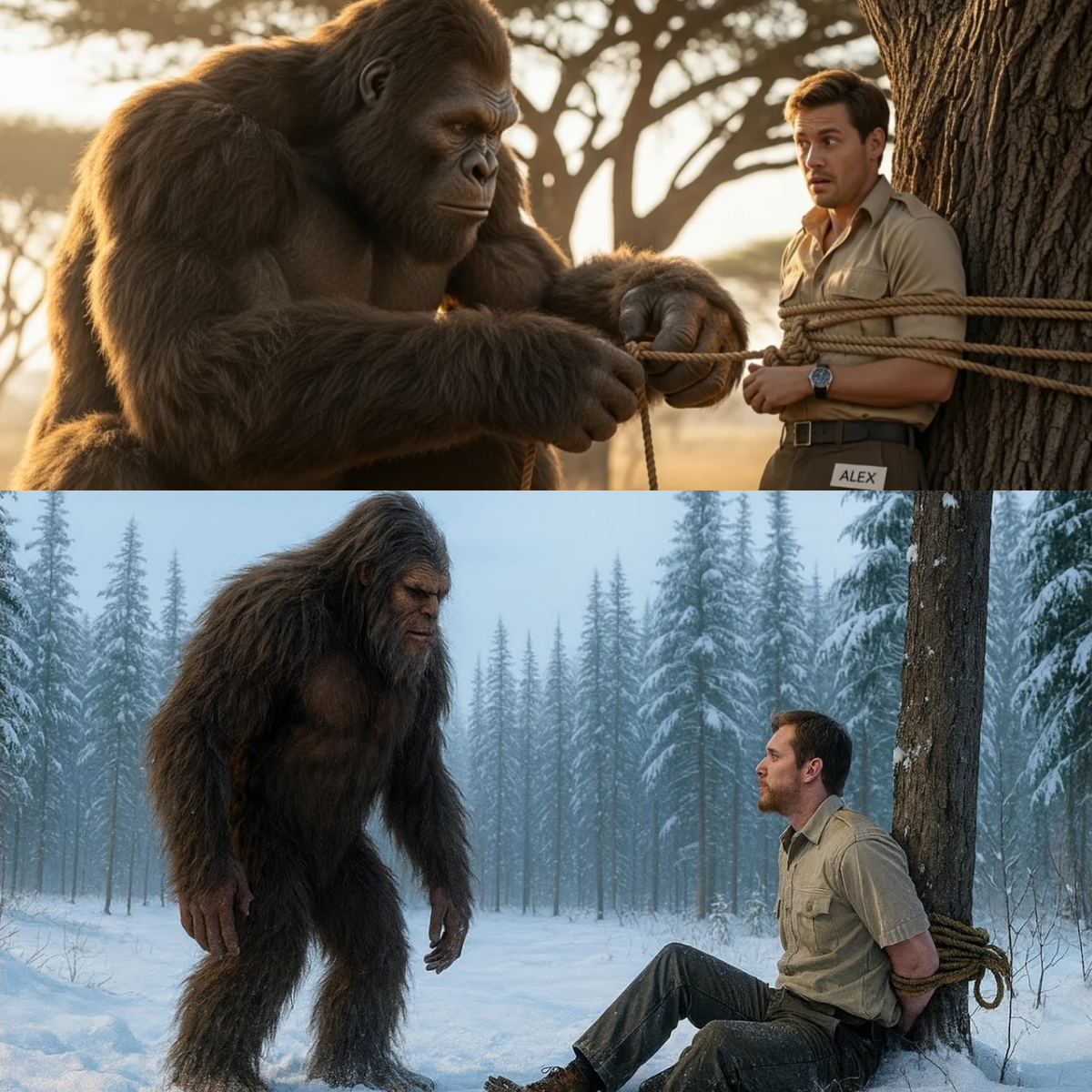 With surprising manual dexterity, the creature began to work. Its thick, powerful fingers pinched at the knots of the sisal rope. Alex held his breath, terrified that one slip of those massive hands would crush his ribs. But the Bigfoot worked like a master craftsman, pausing to sniff the air or adjust its grip.