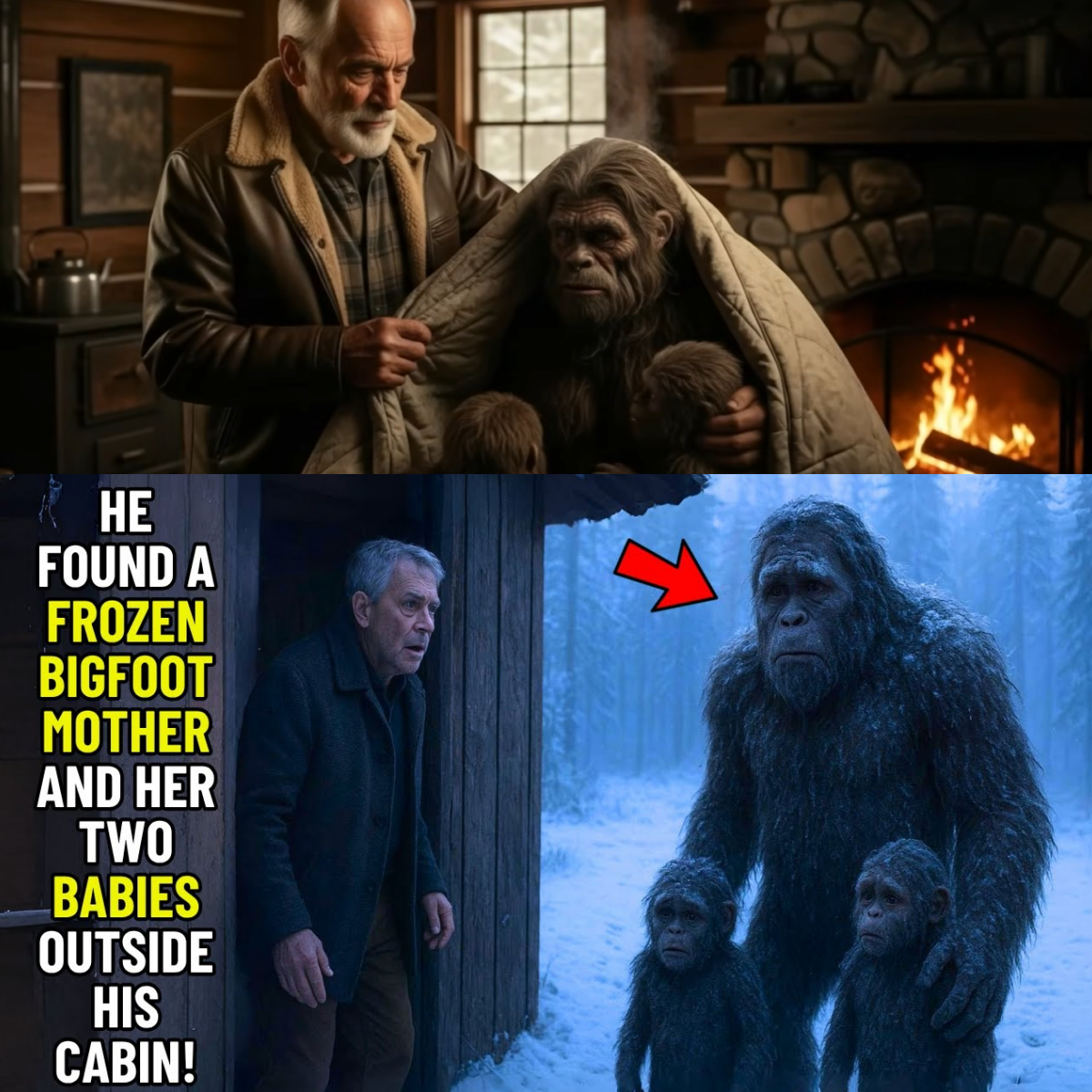 Lying half-buried in a drift on his porch was a mountain of fur. It was a female Sasquatch, nearly eight feet tall, her silver-tipped hair matted with ice and frozen blood. She was curled in a fetal position, her breathing so shallow it barely stirred the snow. But it was the two smaller shapes clinging to her side that broke Percy’s heart.