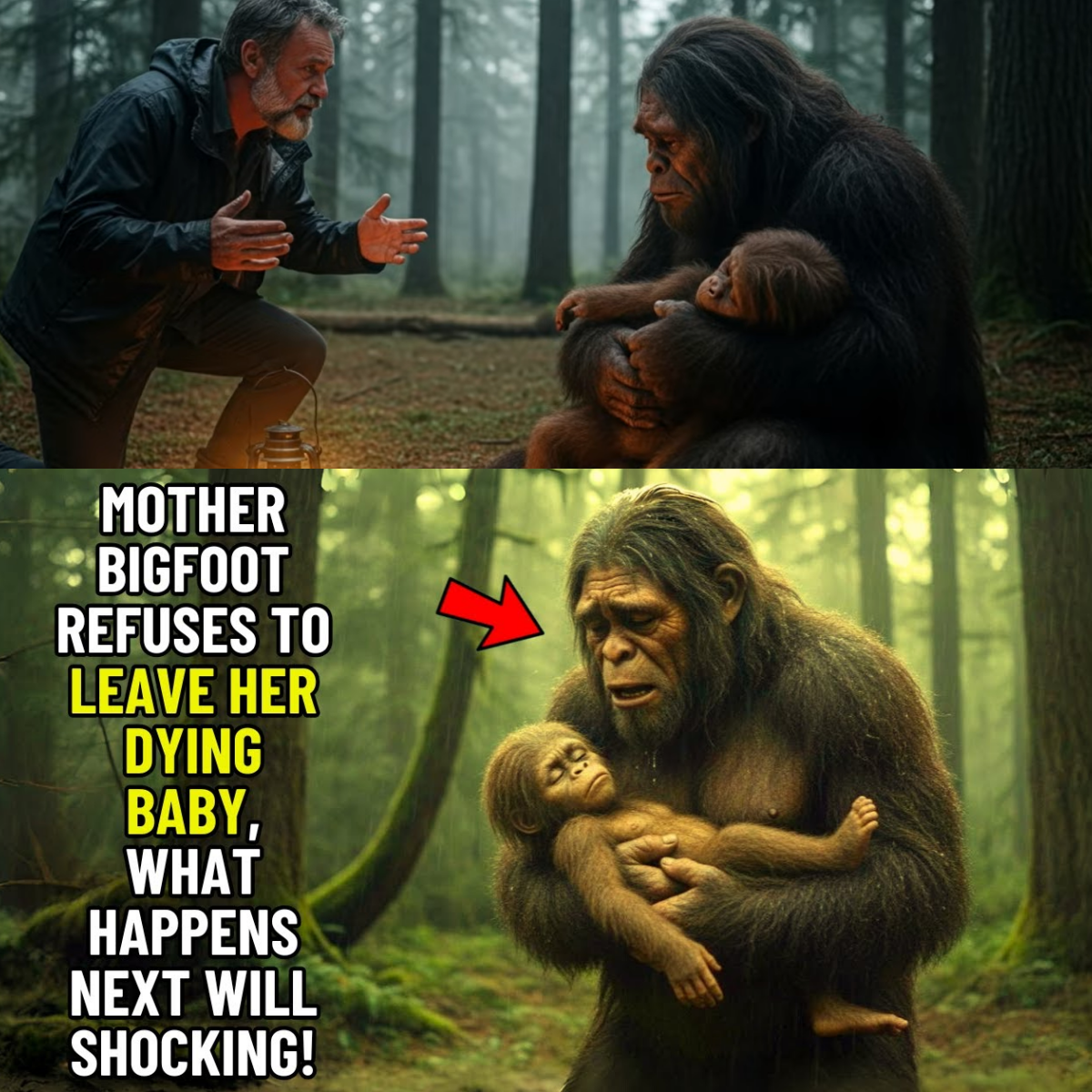 A massive female Bigfoot—nearly nine feet tall—crouched on the forest floor. In her arms lay a smaller form, a silver-furred infant, limp and silent.