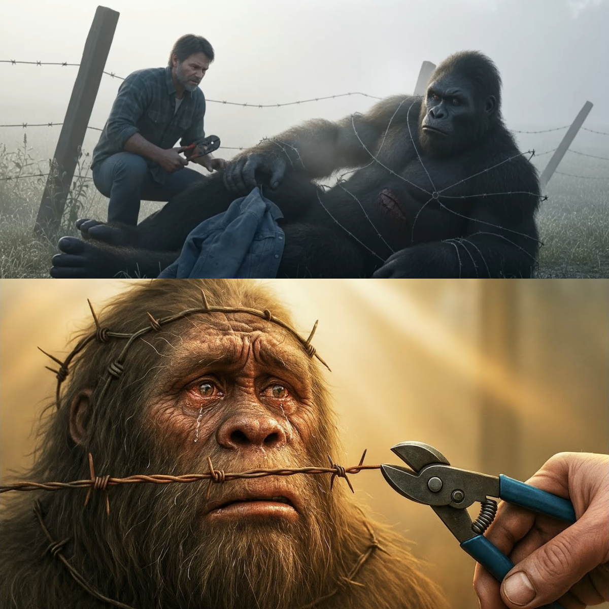 As the first wire snapped with a sharp clink, the Bigfoot flinched, but it didn’t lunge. Ethan worked for an hour, sweat soaking his shirt despite the chill, cutting away the rusted steel inch by inch. Every time a barb came free, the creature let out a low, huffing breath. Finally, the last strand of wire fell away.