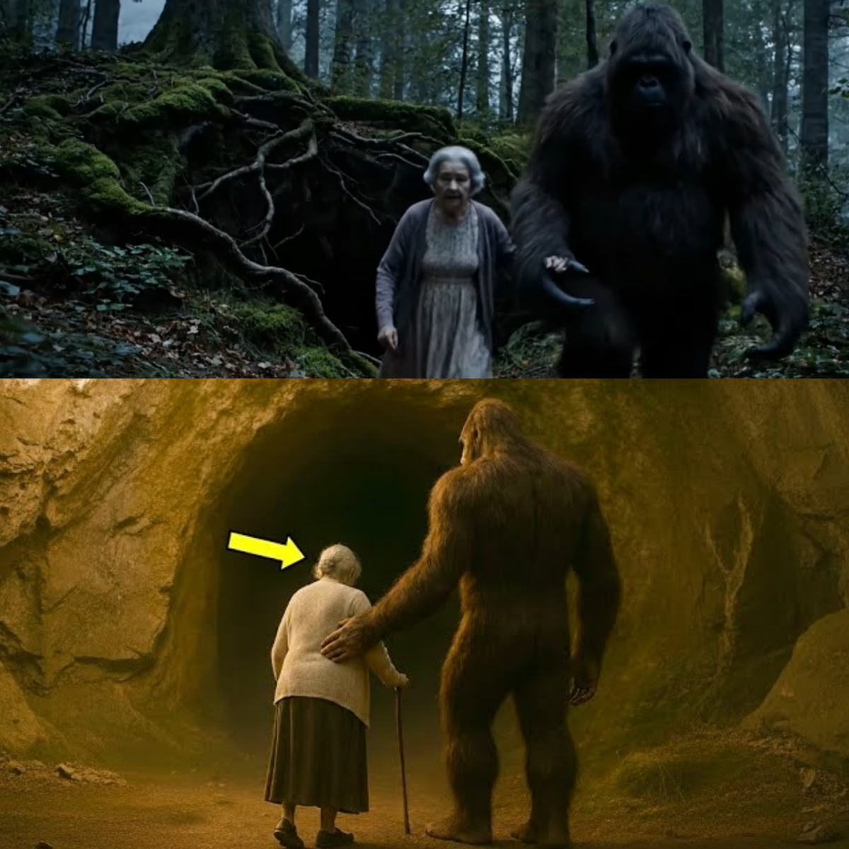 Koko reached out a hand. Alara took it, her small, wrinkled palm disappearing into his massive, warm grip. The cave swallowed them. It was pitch black, yet Koko guided her with supernatural certainty. After what felt like an hour of twisting tunnels, the absolute blackness began to lighten into a soft, greenish glow.