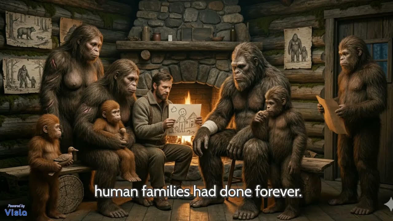 A sound from the corner made him turn. Three young Bigfoot emerged from a doorway, their sizes suggesting different ages. The smallest, barely four feet tall with soft cinnamon fur, clutched a carved wooden toy. The middle one, gangly and adolescent, held what appeared to be a woven basket. The largest, nearly adult-sized, stood protectively in front of the younger two.