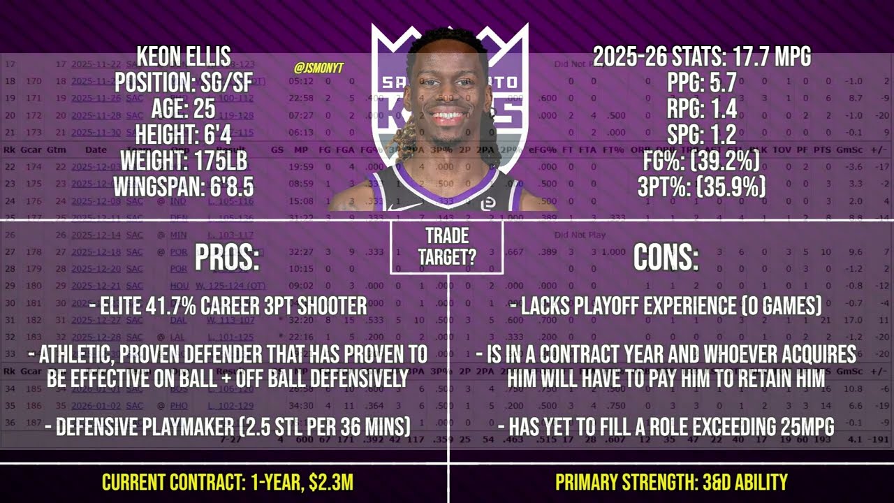 Keon Ellis has quietly become one of the most intriguing trade chips on the market. At 25 (soon to be 26), Ellis is a young, athletic, two-way guard who offers legitimate three-and-D value. This season, he’s averaging 6 points, 1.5 rebounds, 1.2 steals, and just under an assist per game in only 17 minutes per contest. His shooting splits—35.9% from three (career 41.7%)—are impressive, especially considering his role and usage.