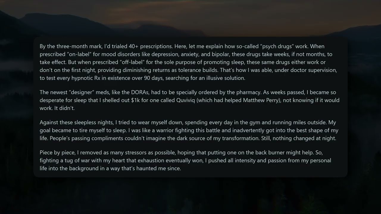 Over the next few weeks, I sought help. I saw doctors, psychiatrists, neurologists. I was prescribed every sleeping pill imaginable—Trazodone, Z-drugs, benzodiazepines, antipsychotics, everything. Nothing worked. I cycled through more than forty prescriptions, each promising relief but delivering only frustration. My sleep was now a distant memory, replaced by a fog of exhaustion and despair.