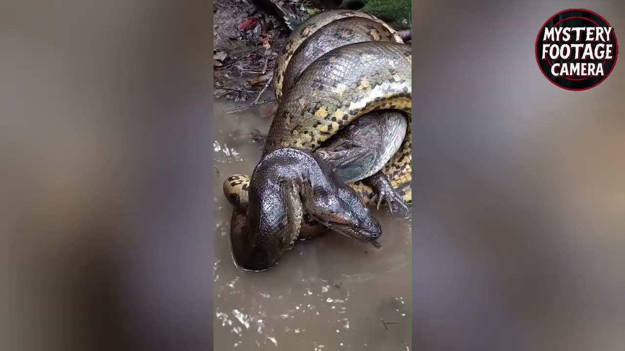 Then the footage shows two massive bodies twisted together in violent struggle—coils slamming into roots and mud with the force of falling timber. Water sprays upward as the loops tighten. Each loop is thicker than a truck tire. One snake’s scales flash golden brown; the other is dark, reflective like oil.