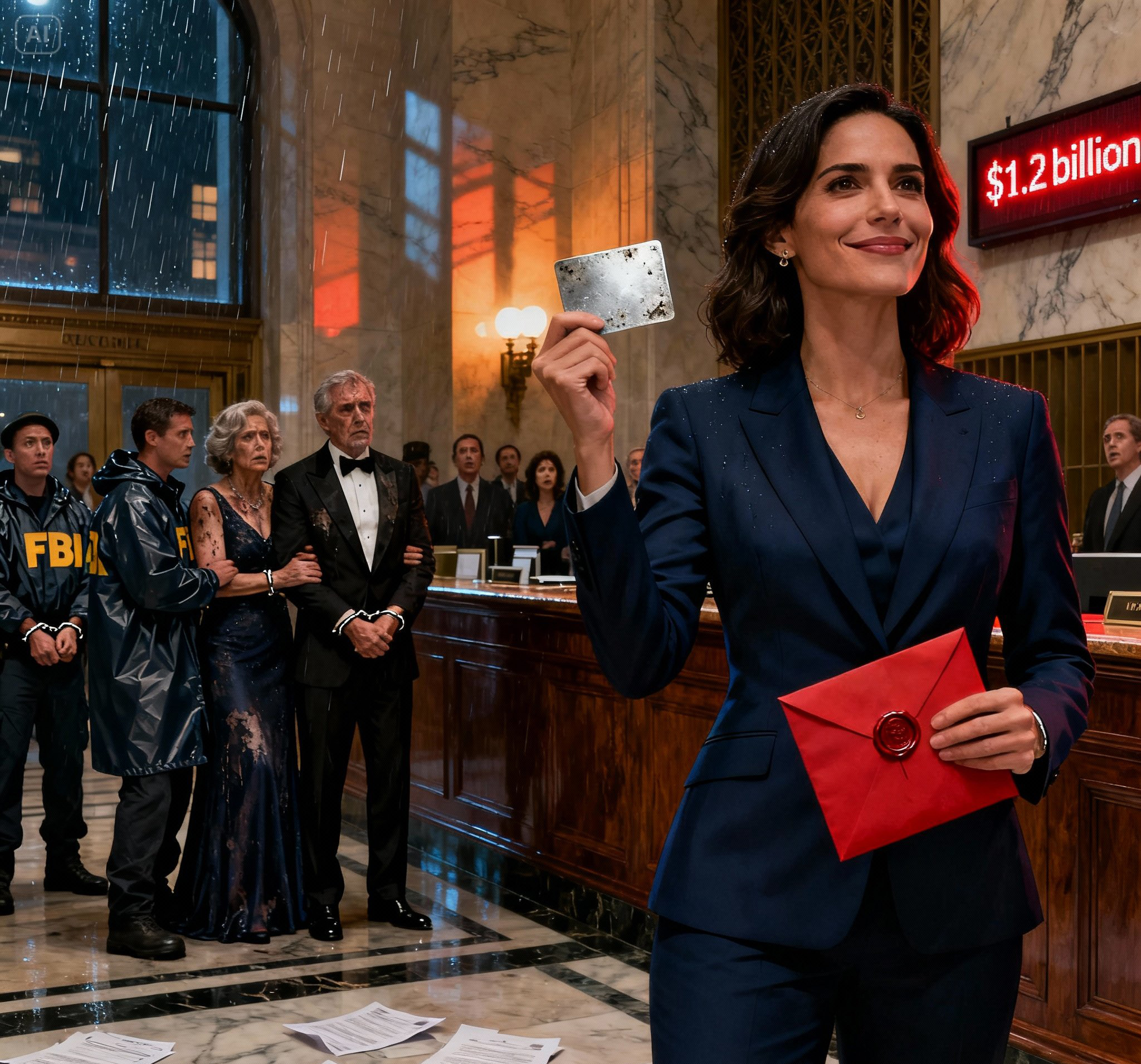 The silence that followed the entry of the federal agents was heavy, suffocating, and absolute. The air in the lobby of Summit Heritage Trust felt less like oxygen and more like concrete. My father, Sterling Caldwell, was still on his knees, his tuxedo trousers soaking up the cold from the marble floor, while the lead FBI agent stood over him like a monolith, but the handcuffs had not yet clicked shut. There was a pause, a suspended moment of horror, where the reality of the situation was still sinking into the marrow of my parents’ bones.