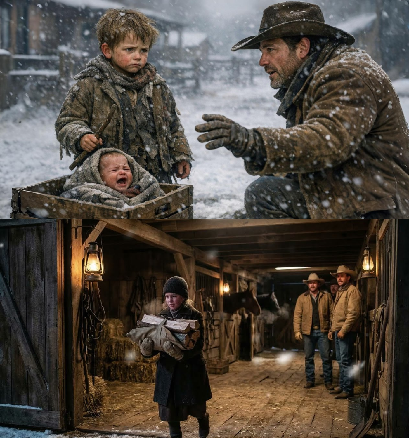 The world had turned white and quiet, except for the soft crying coming from the wooden crate. Samuel Carter stayed kneeling in the snow. He had dealt with spooked cattle, stubborn ranch hands, and more than one armed drunk in his years on the plains, but none of that prepared him for the sight of a six-year-old boy trying to defend a baby with a stick.