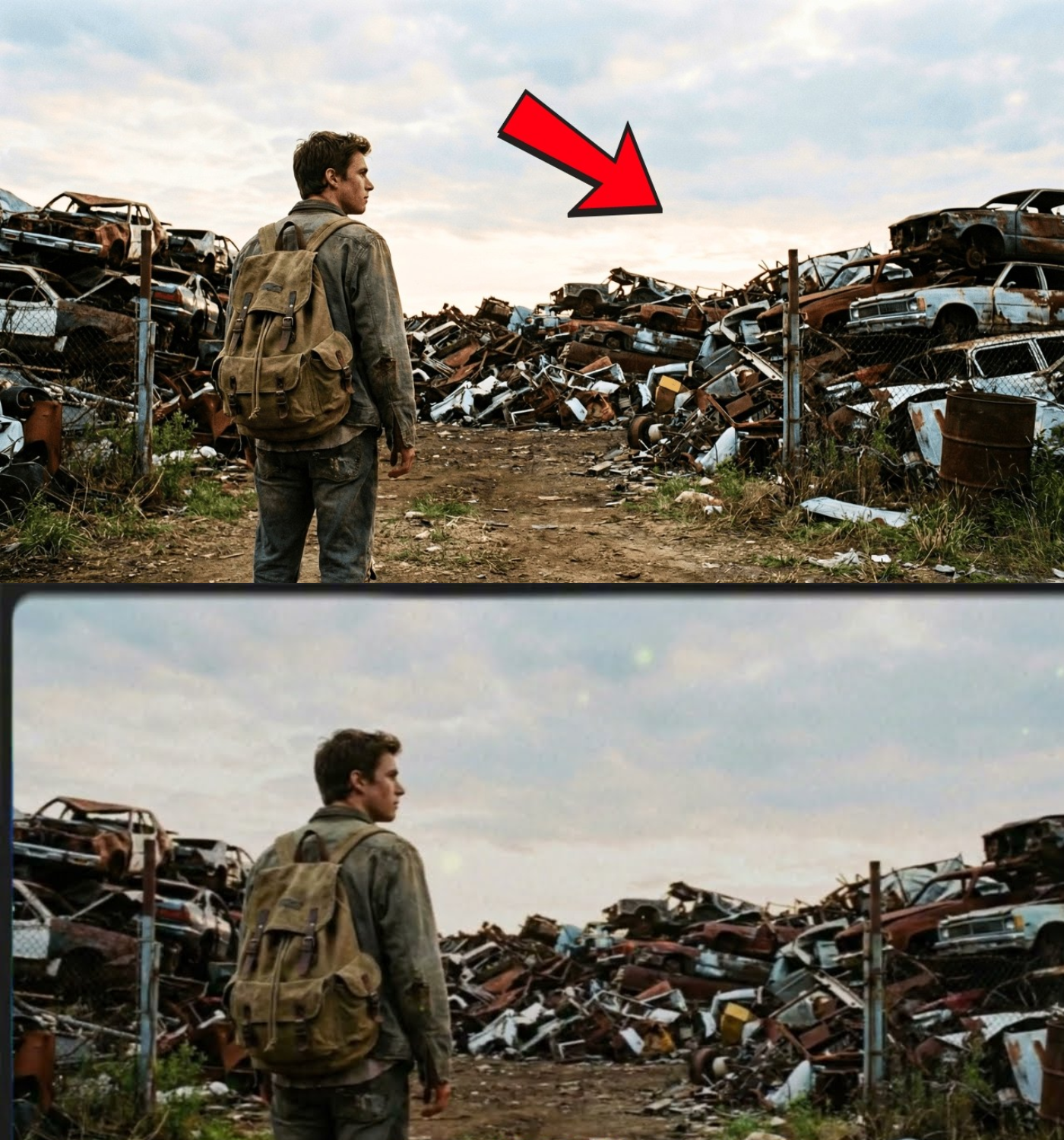 Lucas adjusted his duffel bag and followed the directions on his phone until the signal disappeared. That’s when he saw it. The scrapyard stretched for acres beyond a sagging chain-link fence. Mountains of crushed cars rose like metallic hills—bent doors, shattered windshields, rusted engines—everything stacked in chaotic silence under a gray Midwestern sky. This was his inheritance.