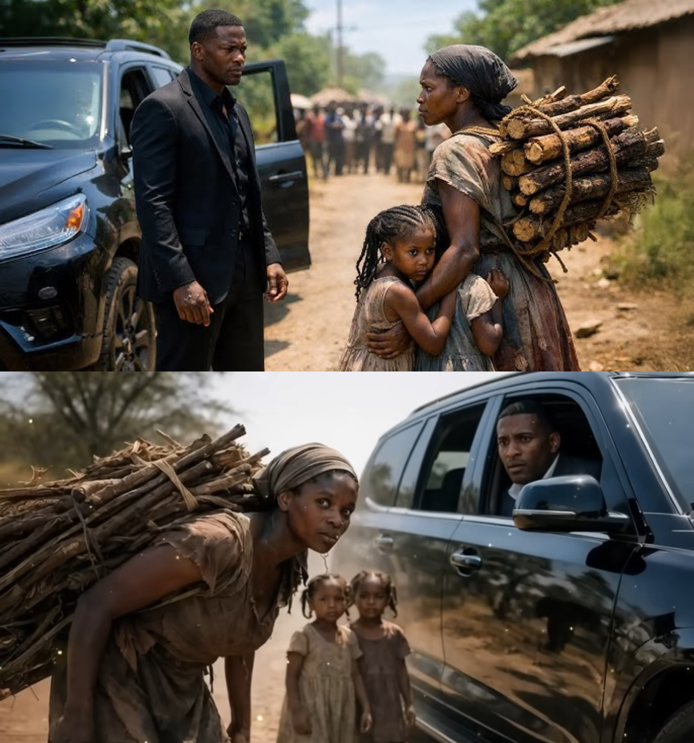 The sun blazed down on the quiet road as a woman, bent under the weight of firewood, took a trembling step forward. Dust clung to her skin, and behind her, two little girls followed, their small feet bare and their eyes carrying an age far beyond their years. Suddenly, a sleek black luxury car came to a stop, its engine falling silent. Inside, a powerful man named Nana Ajiman froze, his breath caught in his throat as his eyes locked onto the woman he never expected to see again—Alice Aiman—and the twin girls who looked just like him. In that moment, time stood still, and a buried past began to scream.