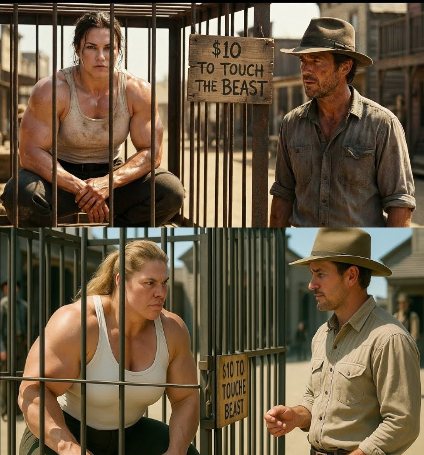 In the dusty frontier town of Willow Creek, tales of the woman in the iron cage spread like wildfire. Known as the giant widow, she was the subject of whispered conversations, scornful laughter, and morbid curiosity. A rough sign nailed to the cage proclaimed, “Touch the giant widow for $10!” The cage stood in the town square, a grim spectacle where ranchers once tied their horses. Now, it drew crowds of onlookers—children perched on their fathers’ shoulders, women clutching their shawls, and young men shoving each other toward the bars, eager to prove their bravery.