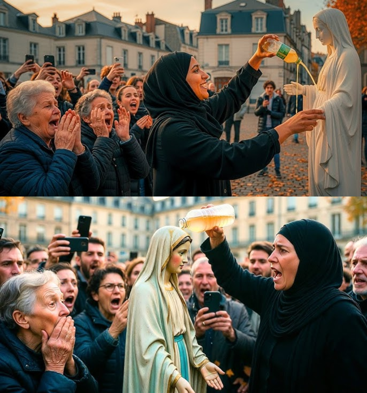 At 9:47 a.m., Amina entered the square, carrying a plastic bottle filled with her own urine. To the casual observer, it might have appeared that she intended to water the flowers at the statue’s base, a common practice among residents. But Amina had a different purpose in mind. As she approached the statue, her heart raced with a mix of fear and determination. She unscrewed the cap and poured the contents over the Virgin Mary’s face and chest, watching as the liquid ran down the white stone, pooling at her feet.