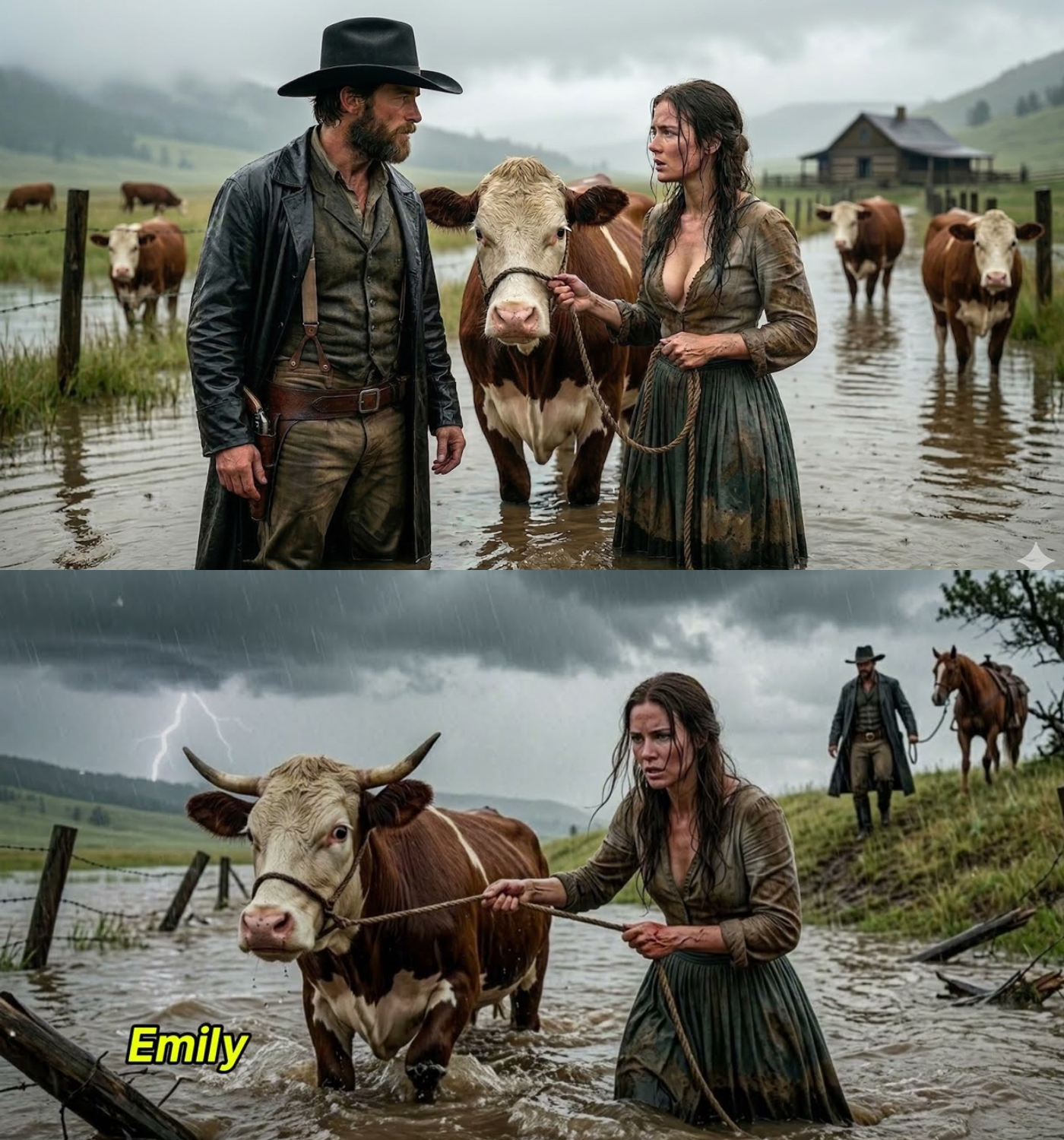 With thirty head of cattle in the lower pasture, Emily felt the weight of her responsibility pressing down on her. Thunder cracked overhead, and the sky turned dark as evening, though it was barely past noon. The creek swallowed the fence line, the hay stacks, and the path that led toward the road. She could run; the house stood on higher ground, dry and safe, but leaving the cattle behind was not an option. Losing them meant losing everything—her farm, her livelihood, and the last piece of her husband that still felt alive.