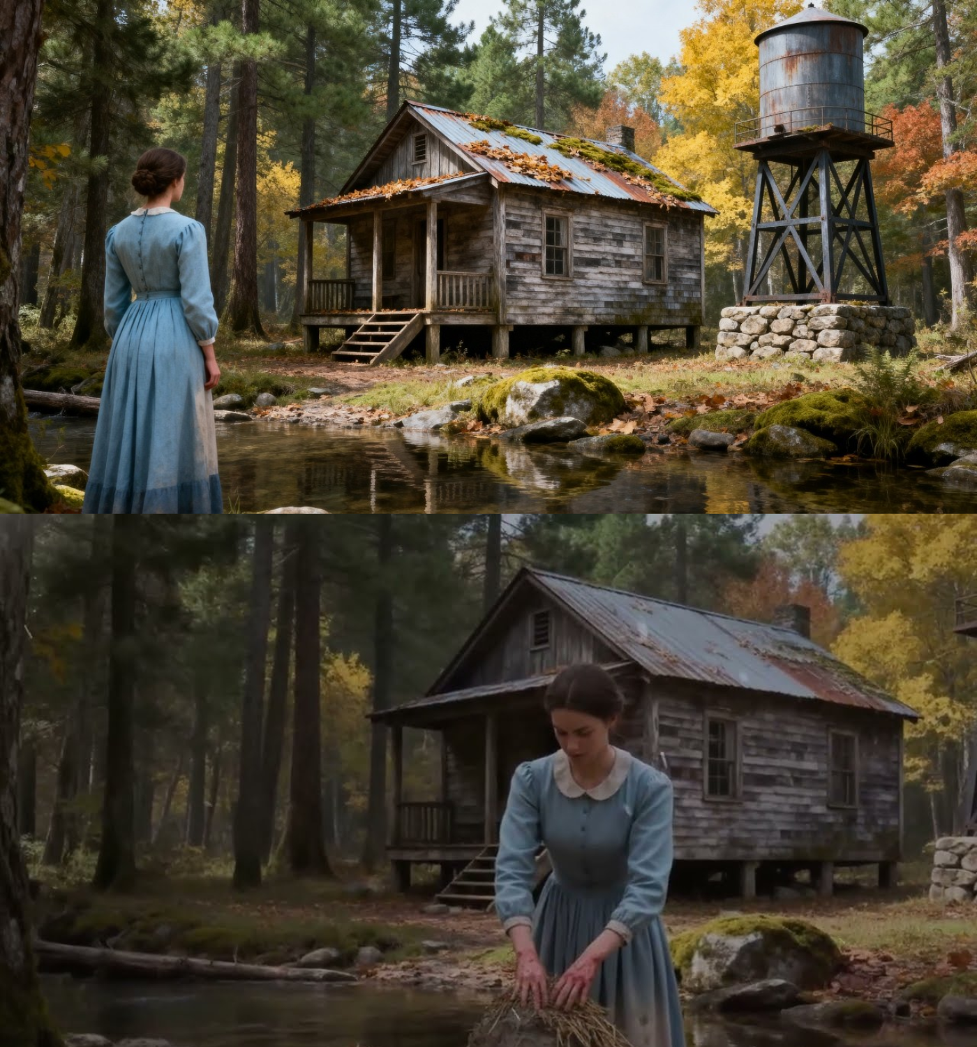 On the fourth day, as she struggled to lift a fallen beam, a man approached the clearing. He was tall and broad-shouldered, carrying a heavy leather roll of tools. It was Henry, the town’s blacksmith, who rarely spoke more than three words at a time. He watched her for a moment, taking in the repaired sections of the wall. “Sheriff said a woman was up here trying to live in a ghost house,” he said, his voice deep and resonant.
