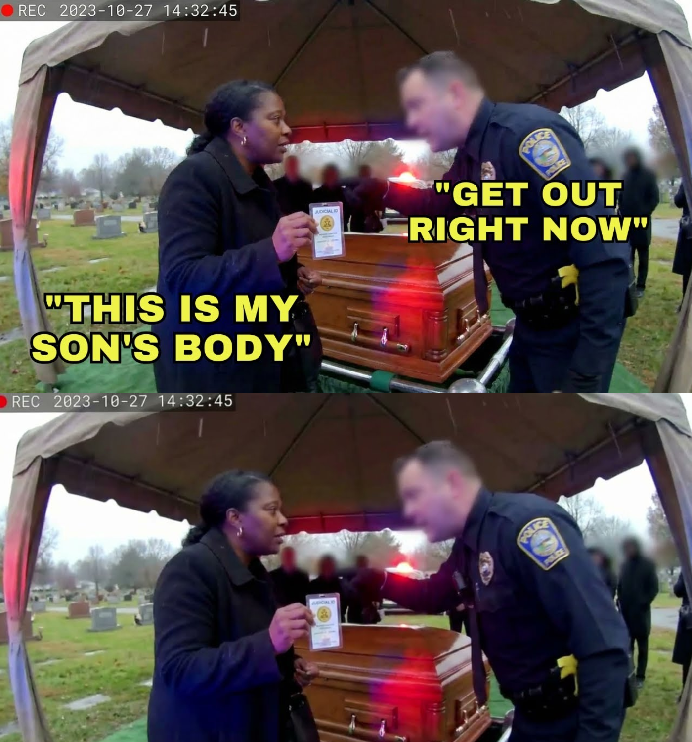 Officer Marcus Webb, a veteran of the Georgia State Patrol, responded to Kellerman’s call. Despite his experience and training in de-escalation, Webb approached Justice Crawford with an aggressive demeanor, demanding that she step away from the casket. When she identified herself as the deceased’s mother and a Supreme Court justice, Webb dismissed her claims, insisting, “Justice Crawford is white.”