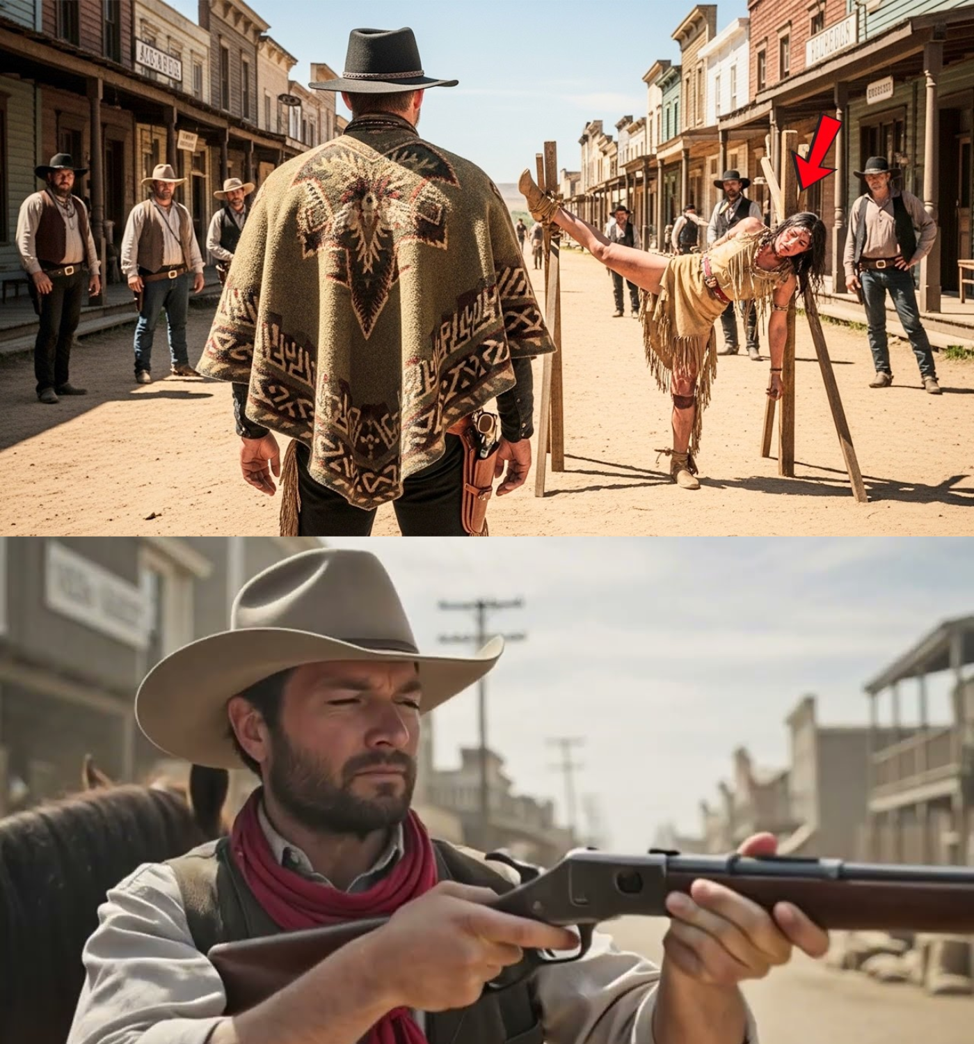 Sheriff Elias Boone stood on the porch of his office, his expression betraying a flicker of concern. He had seen men like this drifter before—those who carried an air of danger and did not belong anywhere. As the crowd formed a circle around Ayana, Boone Cutter, a notorious member of the Black Vultures gang, taunted her with a cold smile. “Take a good look,” he said, forcing her chin up with the butt of his rifle. “This is the price for refusing to kneel before Victor Crow.”