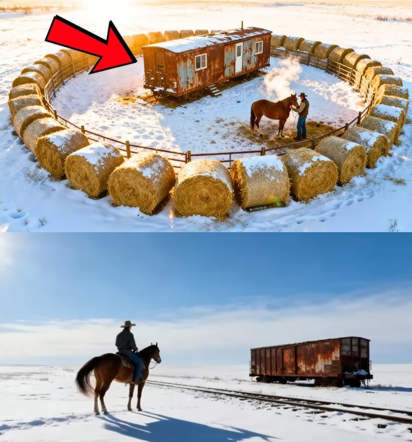 In a peculiar circular arrangement on the edge of town, steam rose from a small metal chimney piercing the roof of an old railroad caboose. Around this weathered red structure, massive round hay bales stood sentinel in a perfect ring, their combined weight exceeding twelve tons. Each bale measured five feet across and stood nearly as tall, wrapped tight with hemp twine. This hay fort formed a barrier that turned the howling gale into a whisper.