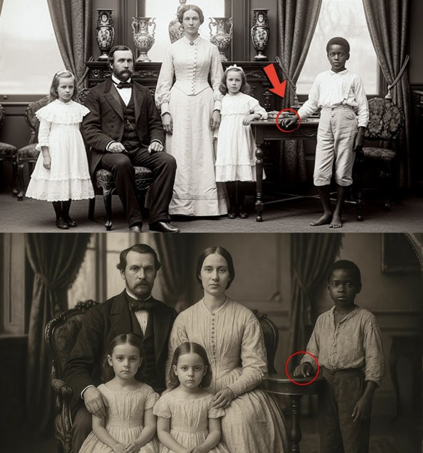 But to the right of the family stood a young Black boy, perhaps seven or eight years old. He wore simple cotton clothing, and his bare feet contrasted starkly against the plush carpet. His posture was stiff, his face serious, and his eyes were cast down. As James examined the photograph, he noticed something unusual about the boy’s right hand. It was not relaxed; instead, it seemed to be holding something tightly.