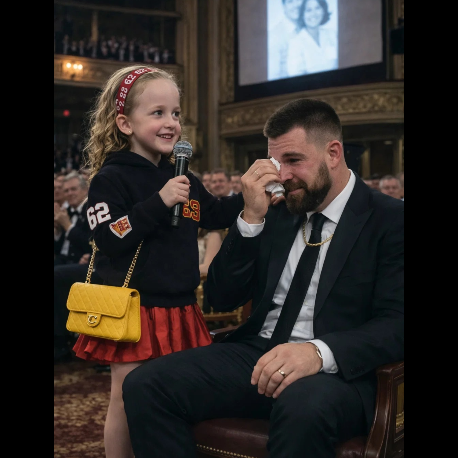 Jason Kelce, seated in the audience, wasn’t hearing music. He was hearing his life — the story of who he was, reflected back to him through the voice of the little girl he was raising.