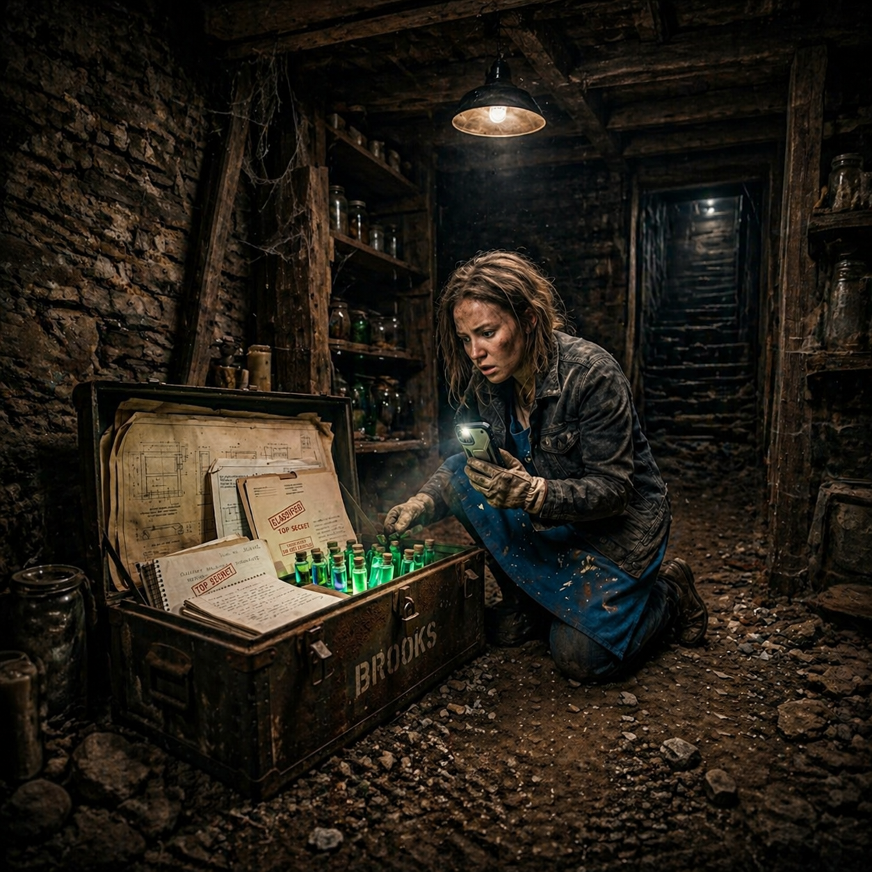 She descended cautiously, her phone flashlight trembling in her grip. The air grew colder with each step, and her breath misted in front of her. At the bottom, the room opened up, and Megan stopped dead in her tracks. Before her was a large steel chest, weathered and rusted with age, sitting in the center of the stone floor.