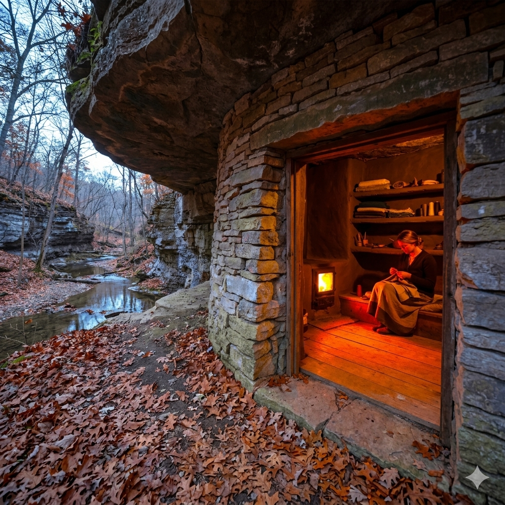 The final space was 11 feet deep, 18 feet wide, and 8 feet tall, with a plank floor, three clay shelves for storage, a working firebox, and a dry-stacked limestone front wall with a framed doorway. The creek outside was low, the ravine walls rising on either side. It was small, but it was hers. It was a space she had created, a room that had not existed before. The space was warm, solid, and protected from the wind. The work was finished.