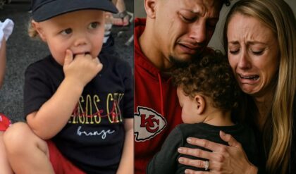 In a photo posted on Instagram by Tavia Hunt, wife of Chiefs owner Clark Hunt, Brittany can be seen posing in her red-and-black outfit while holding her daughter Sterling, who was just as stylishly dressed. The 3-year-old wore a denim outfit, decorated with sporty patches, the word “Daddy” and Patrick’s No. 15, and tiny red boots trimmed with ruffles at the ankle. She also had a Chiefs-patterned bow in her hair for extra flair.