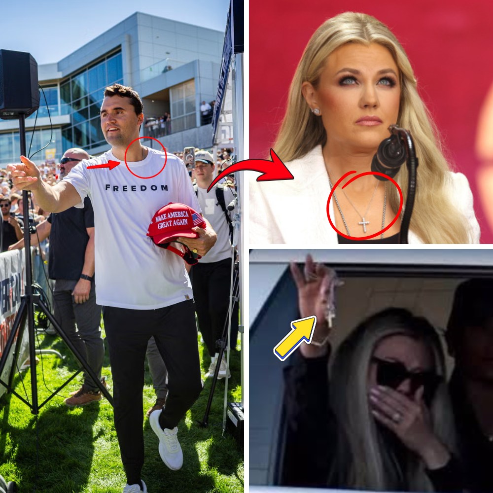 In the dim glow of grief that has enveloped the conservative world since September 11, 2025, one image has emerged as both a beacon of enduring love and a stark emblem of unimaginable loss: Erika Kirk, the poised yet shattered widow of assassinated activist Charlie Kirk, clutching a small, blood-flecked pendant around her neck. This isn’t just jewelry—it’s a talisman, a whisper from the grave, a daily ritual that lets her feel Charlie’s protective spirit hovering over her and their two young children. The pendant, a medal of St. Michael the Archangel—the fierce biblical warrior who vanquishes evil—was ripped from Charlie’s neck by frantic medics as they battled to save his life after a sniper’s bullet tore through his throat at Utah Valley University. Now, stained with the remnants of his final moments, it dangles from Erika’s collar, a crimson-threaded connection to the man whose voice once thundered across campuses and airwaves. But why this pendant? And how does carrying such a visceral memento transform her mourning into a defiant stand against the darkness that claimed him? As Erika steps into her late husband’s colossal shoes as CEO of Turning Point USA, her story grips the nation—not with vengeance, but with a raw, faith-fueled resilience that’s rewriting the narrative of tragedy into one of unbreakable bonds.