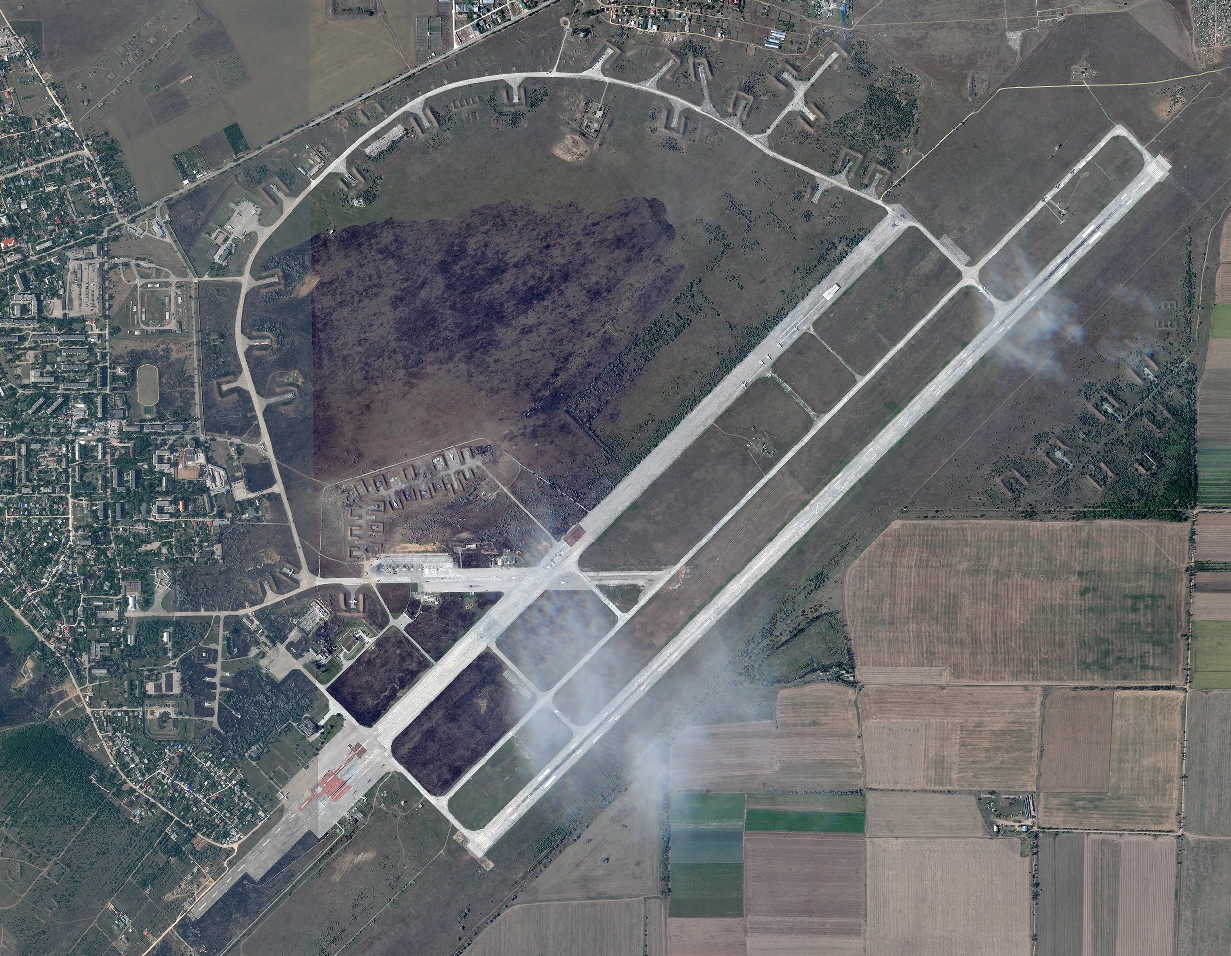A satellite image of Saki Air Base taken on August 10, 2022, the day after a series of explosions ripped through the base. PHOTO © 2022 PLANET LABS INC. ALL RIGHTS RESERVED. REPRINTED BY PERMISSION